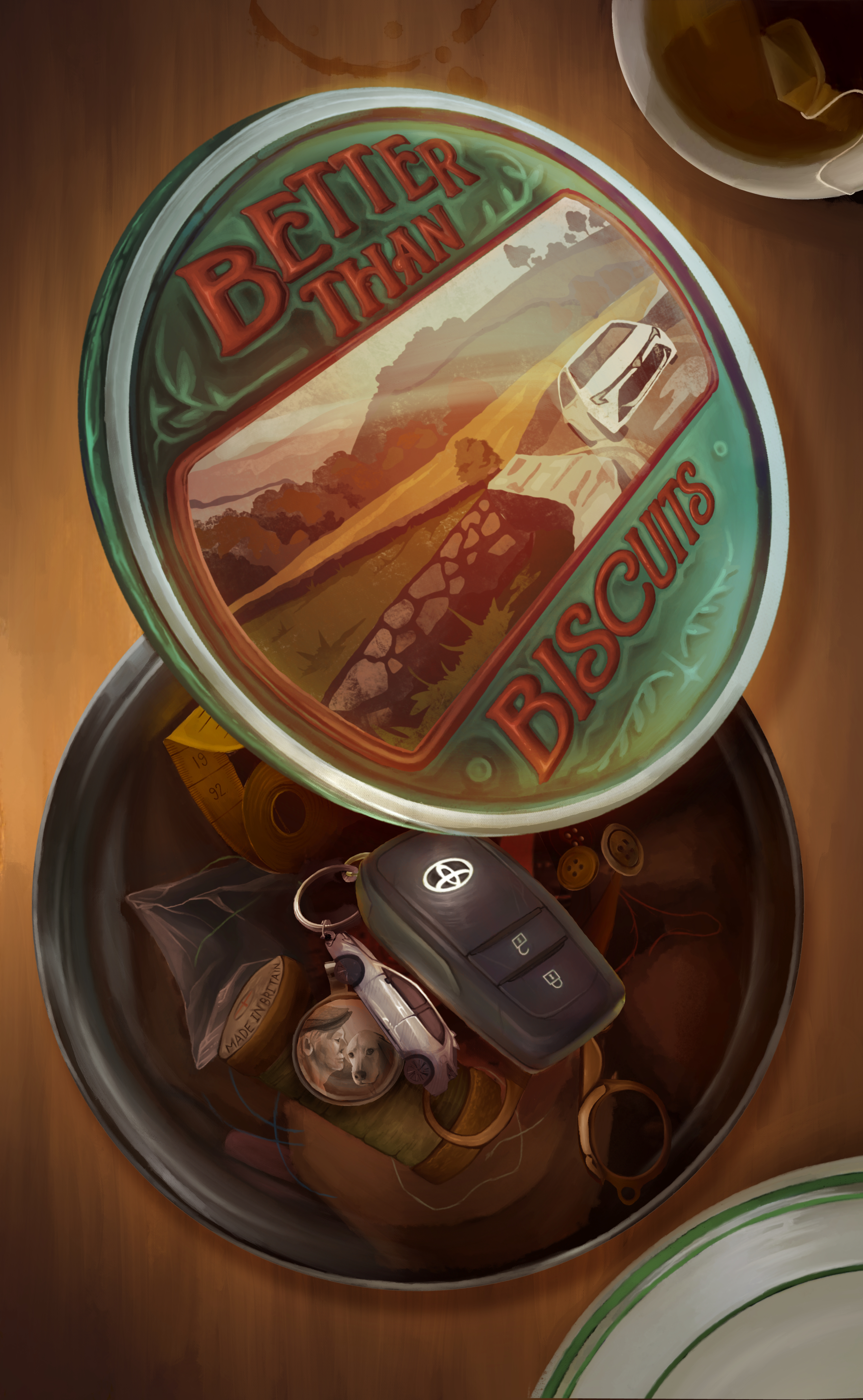 Walters commented: “I was inspired by everyday British experiences, accessible to anyone.  We’ve all at some point hoped for biscuits and been greeted by a sewing kit. I reflected on typical biscuit tin imagery, often depicting beautiful countryside cottages, and wondered how a ‘biscuit tin car’ would fit within that landscape. I chose two specific Corolla colours – green and red – which are traditionally associated with Christmas. Once paired with the comforting glow, I hoped to capture warmth, curating a scene as if the viewer has received a sneakily hidden gift – the keys to a Corolla.