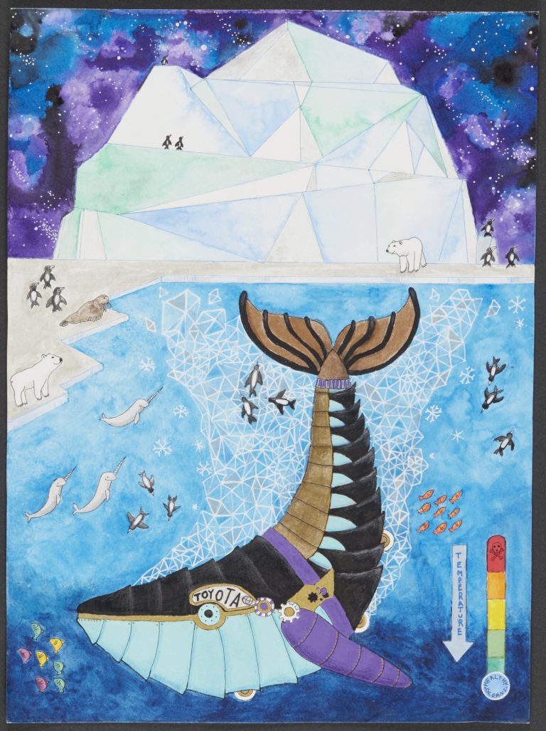 Tess, 11, from Stockport, won a bronze award for her artwork Deep Freeze. Her entry was among 650,000 entered by young people from around the world. Her idea was for a car that can lower the temperature of the ocean, preventing the bleaching of coral reefs and the melting of icecaps.