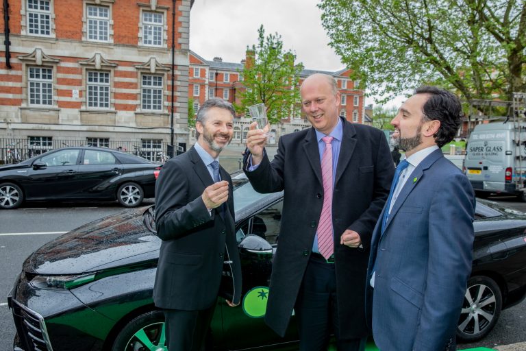 Chris Grayling MP was one of the first people to drive one of 50 new Toyota Mirai hydrogen- fuelled fuel cell electric saloons that are joining the London fleet of green private hire company Green Tomato Cars. He made the short journey from the Department for Transport offices in Westminster, with Jonny Goldstone, Green Tomato Cars co-founder and Managing Director and Paul Van der Burgh, Toyota GB President and Managing Director.