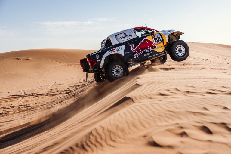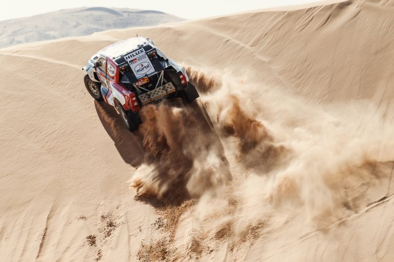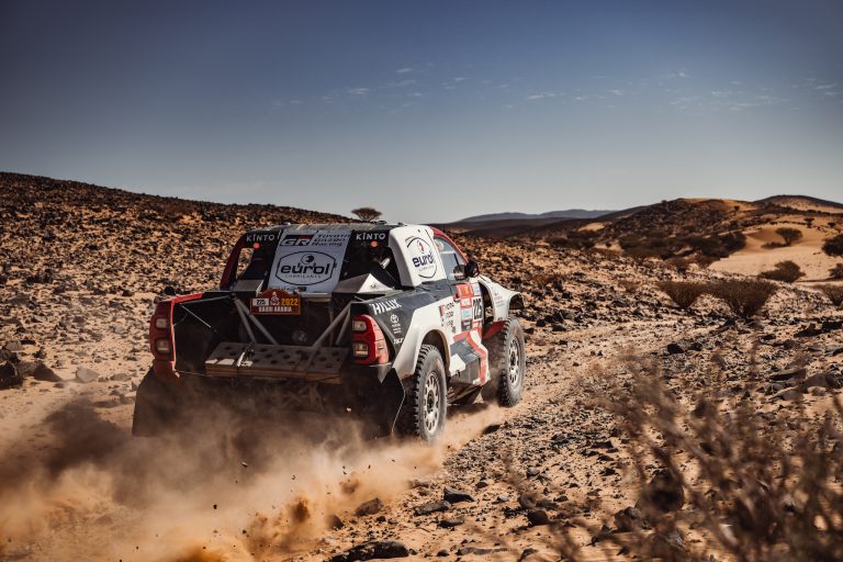 “This was definitely the toughest stage of the rally so far, especially the first 124 miles. The dunes were really soft and not easy to cross, but the Hilux is really good in the dunes, so we had no problems there. However, we seem to be having some issues with the dampers, as it was almost impossible for me to keep the car on the road. We’ll have a look in the bivouac and see if we can find the cause, but even without the damper problems, this was by far the most difficult stage so far. We also had a puncture early on, but in the end, it was really the dampers that stopped us from attacking.”