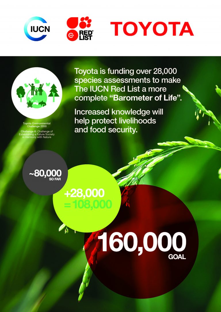 The IUCN Red List assesses the risk of extinction of wild species based on past, present and projected threats. To date, 79,837 species have been assessed and more than 23,000 have been found to be threatened with extinction. The collaboration with Toyota will enable at least 28,000 more species to be assessed over the next five years.