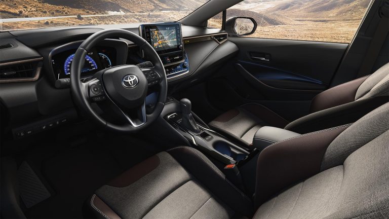 On board, the new Corolla TREK features upholstery in two-tone textile material, matching the decorative wood-finish elements of the dashboard. The TREK logo is present in both the door steps and the tailgate.