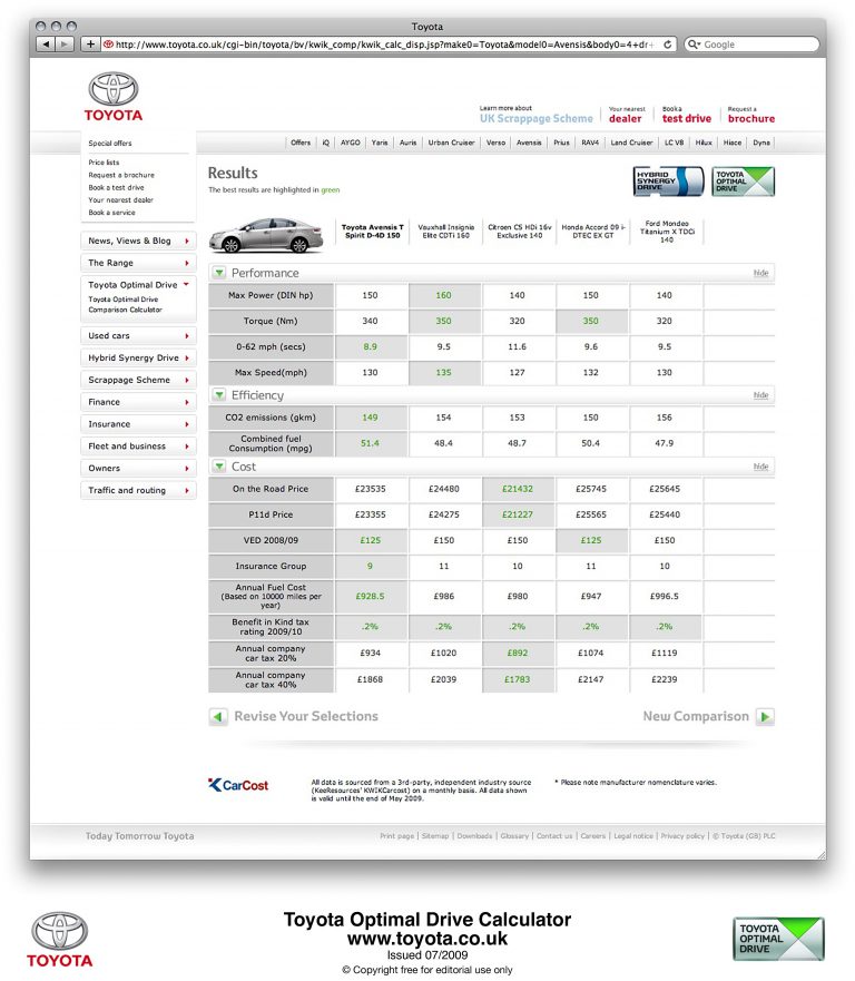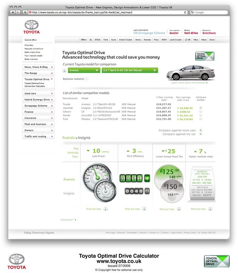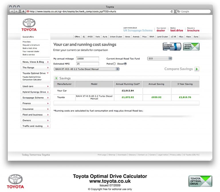 The Toyota Optimal Drive Calculator is a new addition to Toyota’s customer web site, giving motorists the chance to make quick and direct comparisons between rival models or their own vehicle. All the data, updated monthly, are sourced from KeeResources’ KWIKCarcost.