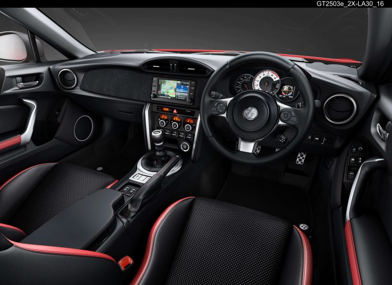 The GT86 rides on new, slim 10-spoke 17-inch alloys with a machined finish. Equipment features include adaptive LED headlights, cruise control, electric, heated door mirrors with a folding function, aluminium sport pedals, high-performance brake discs and pads, hill start assist and smart entry with push-button start.
