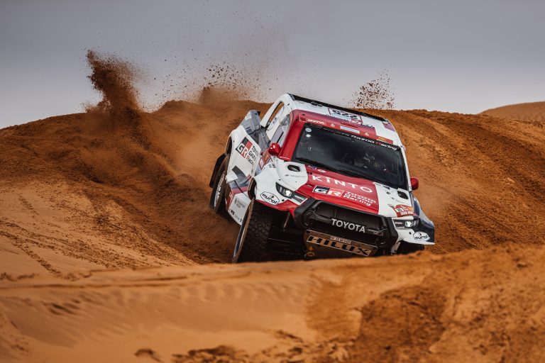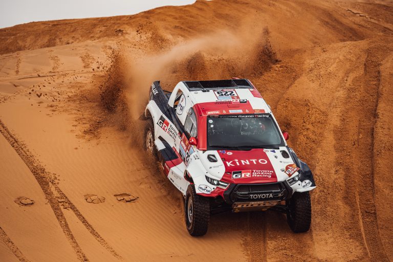 Nasser Al-Attiyah and co-driver Mathieu Baumel posted the second-fastest time on Stage 2 of the 2022 Dakar Rally, losing 3min 28sec to the stage winners. The Toyota Gazoo Racing crew launched their Toyota GR DKR Hilux T1+ into the stage as the first car on the road but managed to restrict their time loss despite a puncture mid-stage.