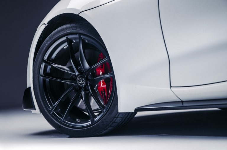 The GR Supra 2.0 is fitted as standard with 18-inch five-double-spoke alloy wheels with a bi-tone black/bright machined finish. To optimise the balance of front and rear grip, larger wheels and tyres are used at the rear. The specific Michelin Pilot Sport tyres are 255/40 ZR18 front and 275/40 ZR18 rear. The limited-run Fuji Speedway Edition version has 19-inch forged alloy wheels with a matt black finish, shod with 255/35R19 96Y tyres at the front and 275/35R19 100Y at the back.