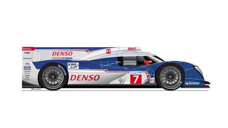 Significant regulation changes in 2016 led to the introduction of the TS050, the latest iteration and a very different animal to its predecessor. Now with a dedicated LMP1-Hybrid category, limitations were placed on energy consumption and fuel flow, so the engine was changed to a twin-turbo V6 petrol engine and 8MJ hybrid system running lithium-ion batteries. This year proved to be one of the closest fights in Le Mans history with Toyota and one of the most heart-breaking finishes. Leading the race on the penultimate lap, with victory finally in sight, the TS050 suffered the failure of a small part and rolled to a halt on the start-finish straight. In recognition of Toyota’s sportsmanship and determination, the ACU (Automobile Club de l’Ouest) awarded the team the chequered flag from the race, which is still on display at our race HQ in Cologne, Germany.