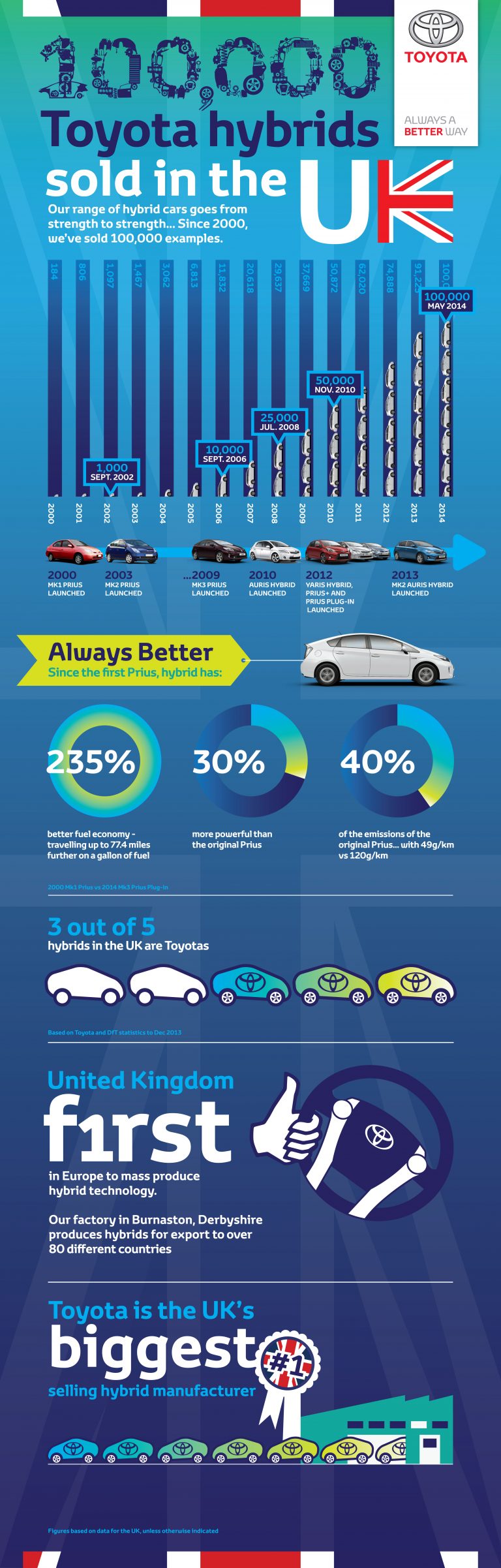 On 19 October 2000, the first day of the British International Motor Show, Toyota launched UK sales of its first-generation Prius. Fourteen years later it is celebrating 100,000 hybrids sold nationwide, confirmation that its clean, efficient and smooth powertrain technology is now an accepted and popular part of the mainstream motoring market.
