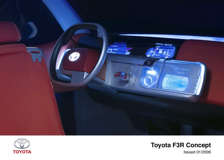 The F3R’s design emphasises environmentally sensitive materials, in keeping with the theme of environmental sensitivity suggested by the Hybrid Synergy Drive badging. These materials include floor panels made from Ecoresin, a specially formulated resin that can be recycled; and a skin-friendly simulated leather seating material called Mythos that, unlike most plastics, does not produce the harmful chemical dioxin when it is burned.