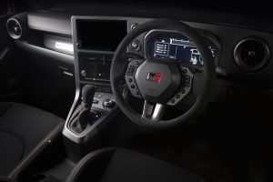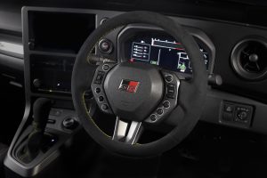 The brake callipers and interior stitching are in Morizo’s signature yellow colour. The steering wheel is another exclusive feature, with a suede finish, a slightly reduced outer diameter and modified paddle shifters. The steering wheel-mounted switches are laid out independently, based on lessons learned with the GR Yaris Rally2 rally car.