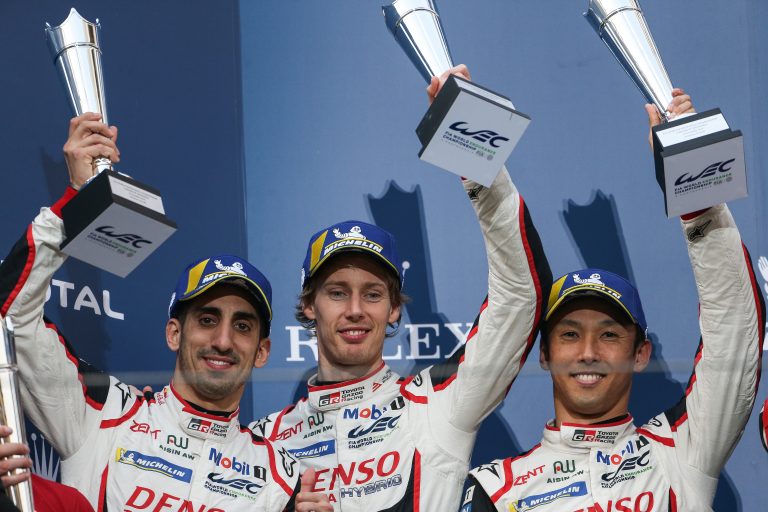 Sébastien Buemi, Kazuki Nakajima and Brendon Hartley in the No8 TS050 Hybrid gained a three-point lead in the drivers’ championship by finishing second, ahead of their team-mates Mike Conway, Kamui Kobayashi and José María López who finished third in the No7 Toyota. In the teams’ championship, Toyota Gazoo Racing have now a 27-point advantage over their nearest challengers.