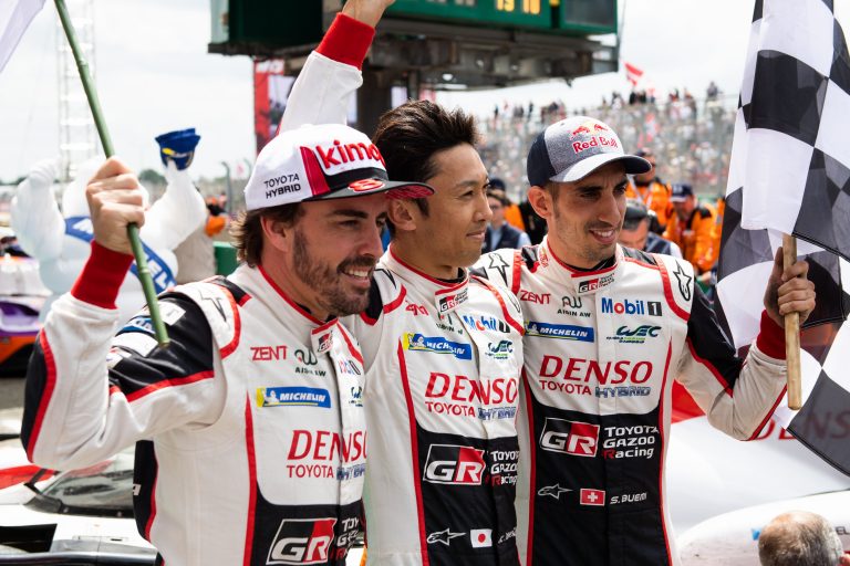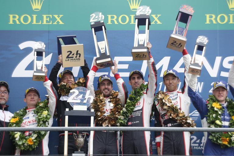 Sébastien Buemi, Kazuki Nakajima and Fernando Alonso defended their Le Mans title in the No8 Toyota TS050 Hybrid, securing them the drivers’ World Championship. They crossed the line with a 16.9-second advantage over their team-mates Mike Conway, Kamui Kobayashi and José María López, who had looked set for victory in the No7 car.