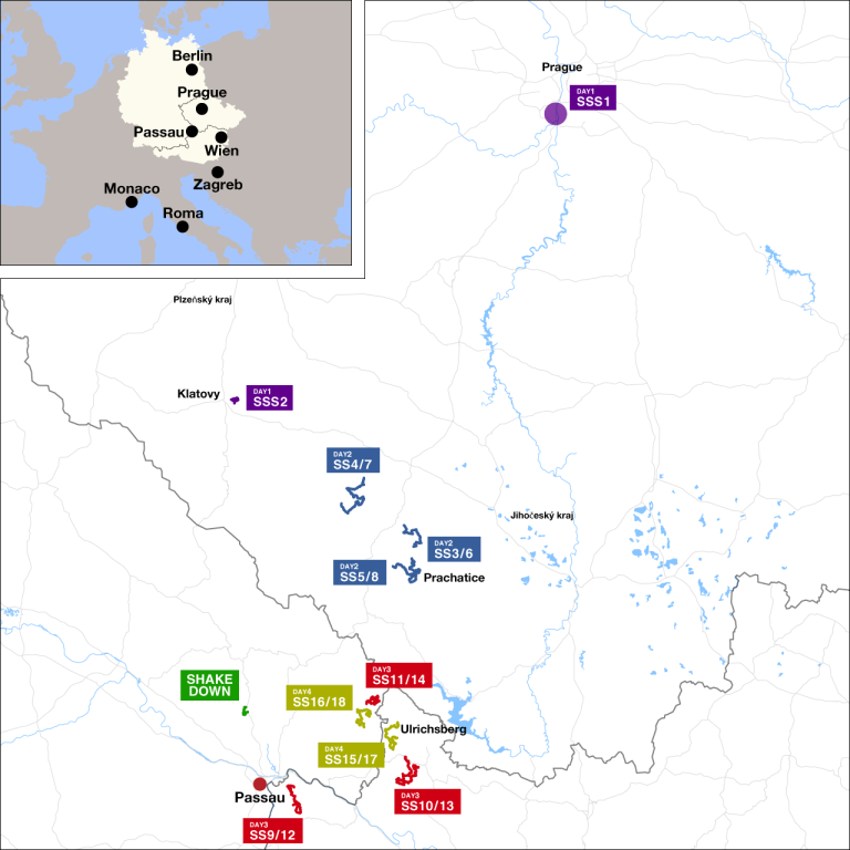 The service park will be located in the German city of Passau with shakedown to take place in nearby Tittling on Wednesday afternoon. The rally will start from the Czech capital city Prague and its famous castle on Thursday lunchtime, before an opening super special stage at the Velká Chuchle horse racing course on the outskirts of the city. A further circuit stage around Klatovy follows in the evening before crews return to Passau.