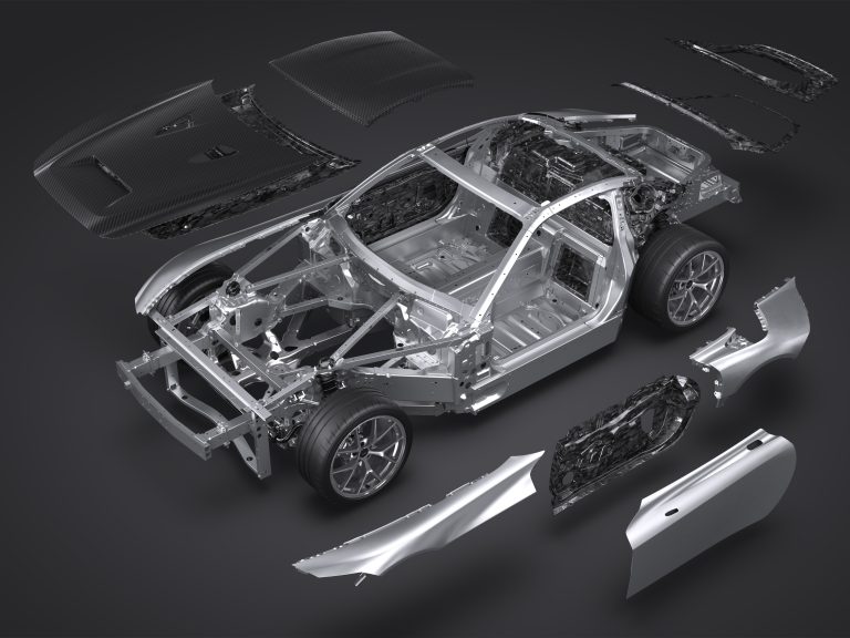 The mainstay of the GR GT’s low weight with high rigidity is Toyota’s first all-aluminium body frame. A high level of rigidity has been achieved by positioning large aluminium castings in the frame’s main structure, as well as through optimal placement of aluminium extrusions and other components, and the use of advanced joining technologies. Additionally, the model’s body panels are made of aluminium and CFRP.