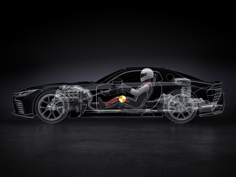 Development of the GR GT, which is ongoing, began with the aim of achieving an exceptionally low centre of gravity by considering how to lower both overall vehicle height and the driver’s position as much as possible. Attention was then paid to adopting a front-engine, rear-wheel-drive powertrain layout for ease of handling when driving the vehicle to its limit. Optimised positioning of heavy components, such as the engine, rear-mounted transaxle, and other major mechanisms, significantly lowered their centre of gravity. Furthermore, the centres of gravity of both driver and car have been made roughly identical by pursuit of an ideal driving position that enhances the sense of car-driver unity and ease of handling.