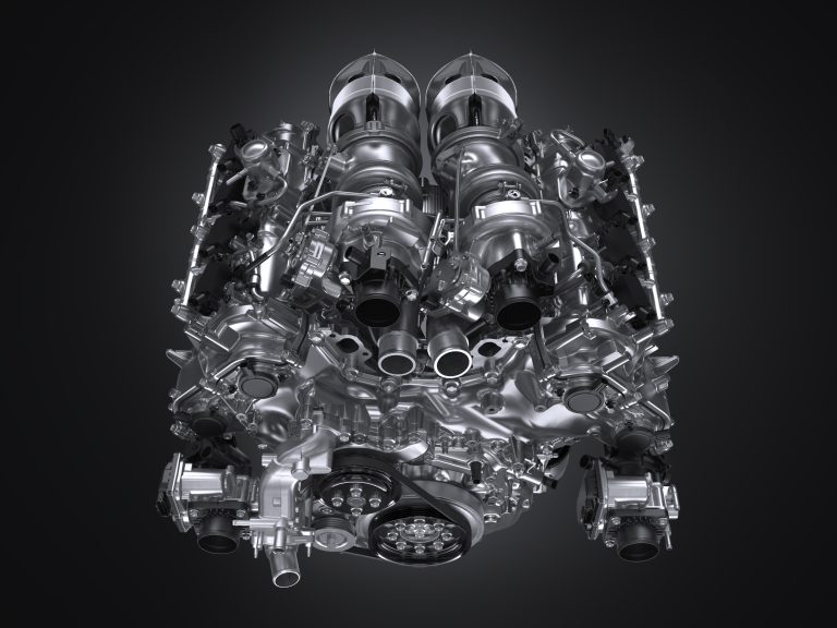 The GR GT’s 4.0-litre, V8 twin-turbo engine, the first to be fitted in a TMC production vehicle, was developed on a “thoroughly compact and light” design concept to help achieve the GR GT’s “packaging of low overall height and a low centre of gravity”. The engine has an 87.5 x 83.1 bore and stroke, the short stroke reducing overall engine height. The hot V configuration positions a turbo in each engine bank. The unit also features dry-sump lubrication and an oil pan with a thinner than usual design.
