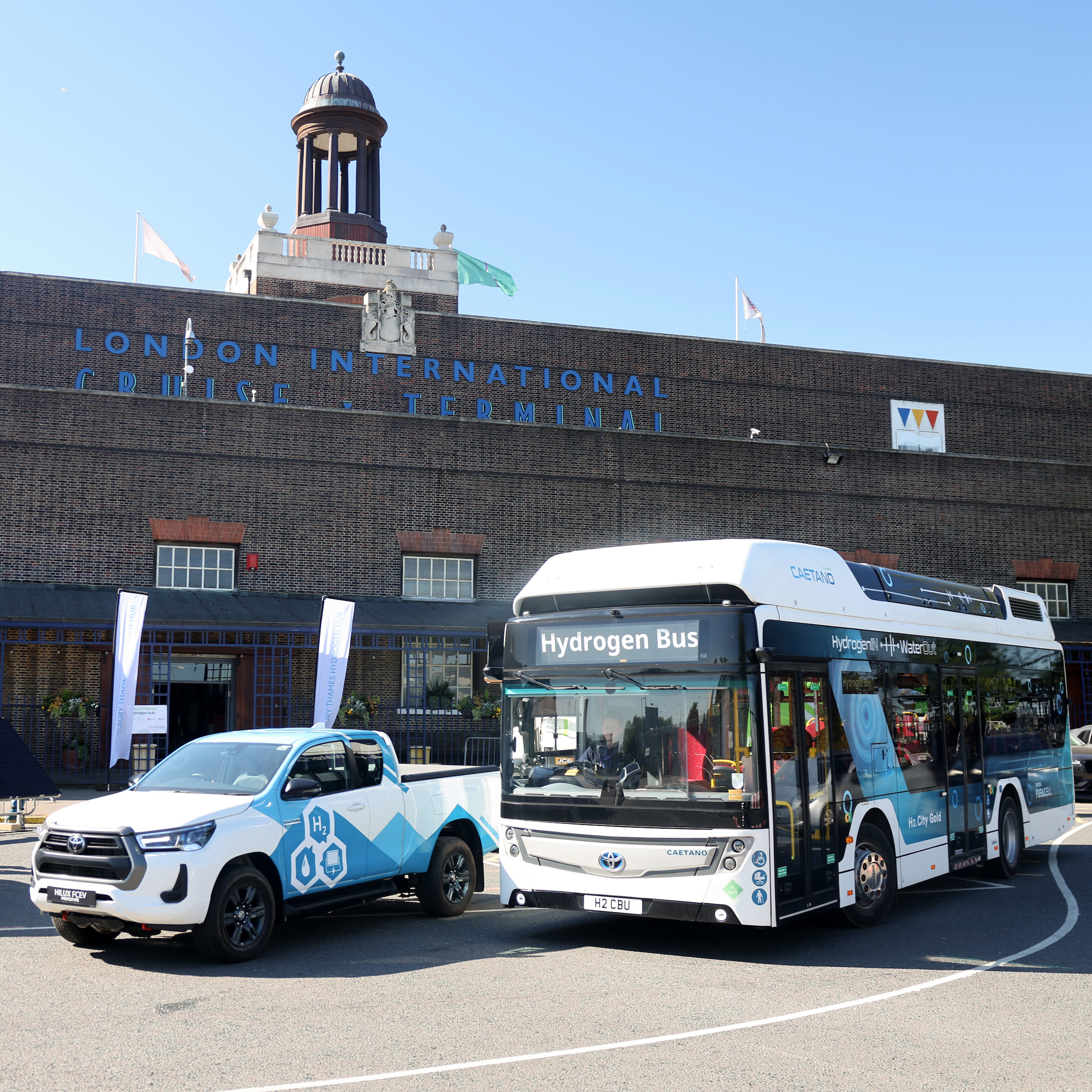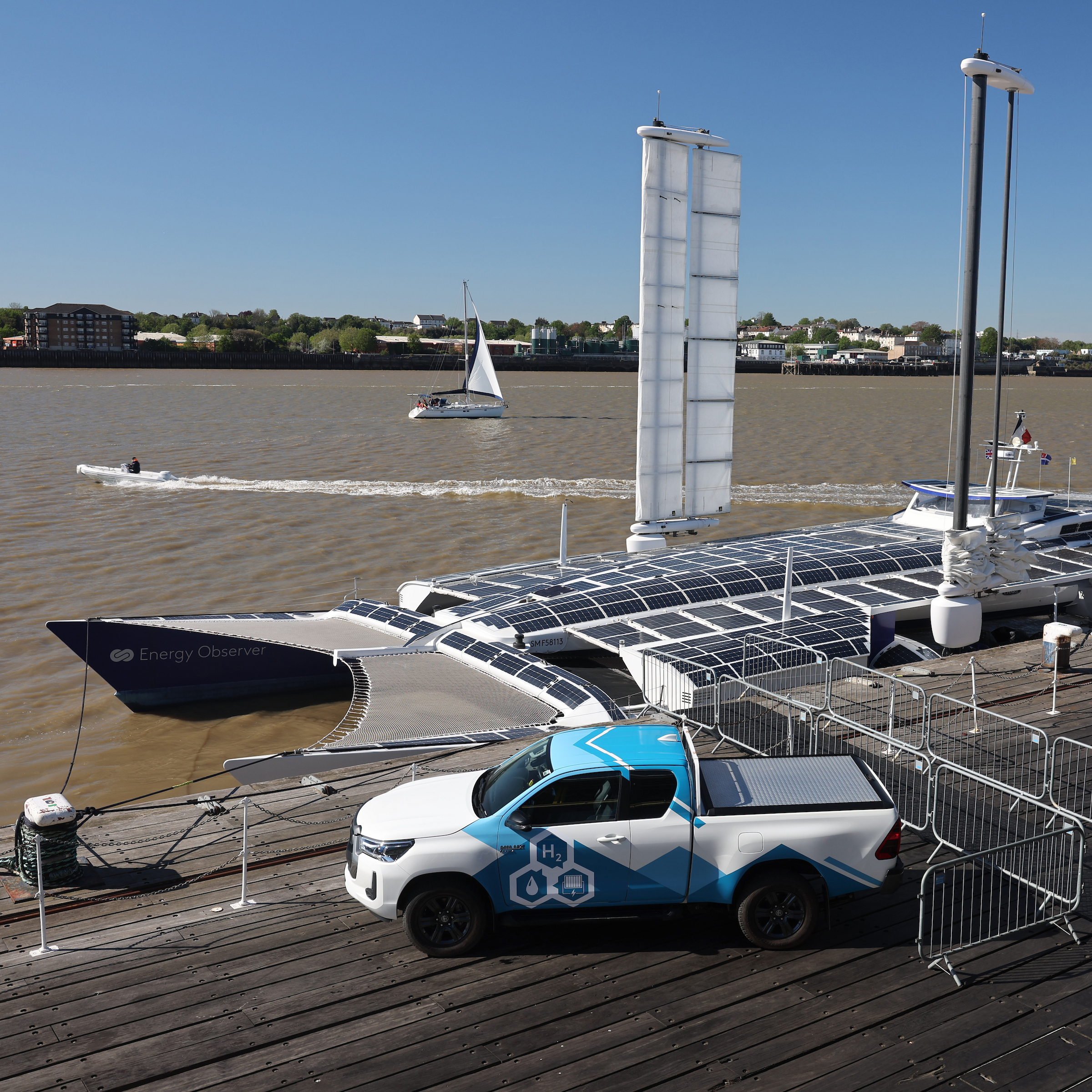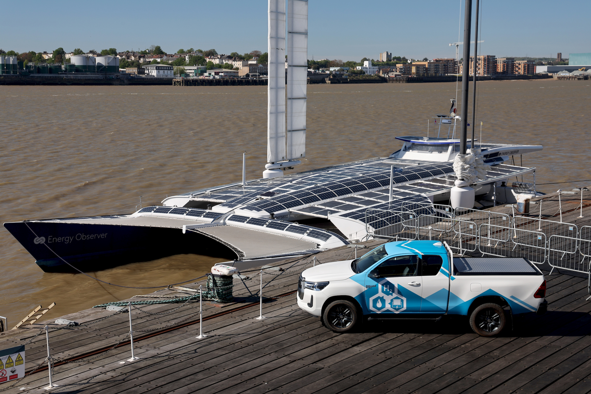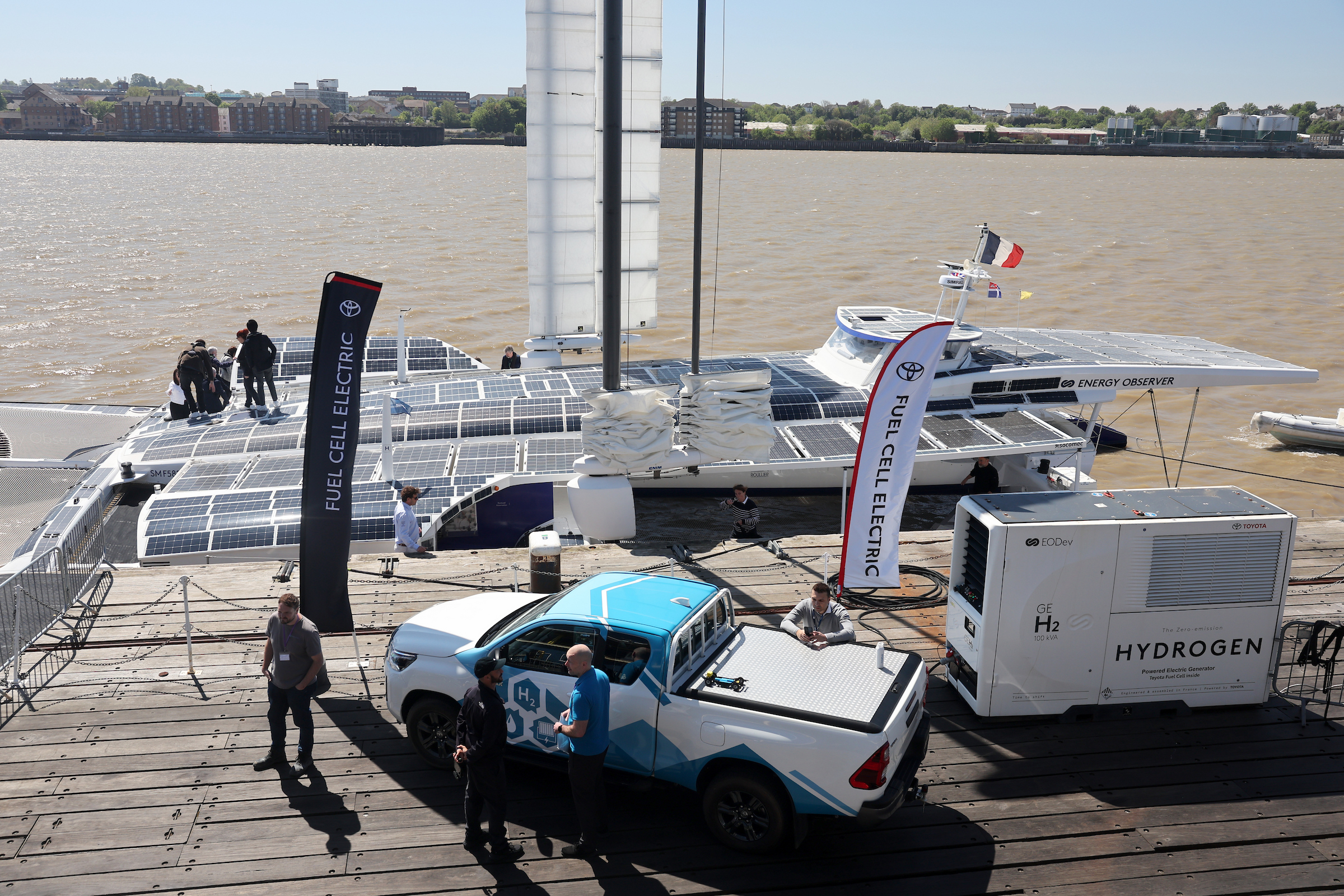 Toyota demonstrated the versatility of its fuel cell technology at a hydrogen showcase hosted today (30 April). The Energy Observer, the world’s first self-sufficient hydrogen-fuelled boat, and a fuel cell prototype Hilux pick-up were featured in the event hosted by the Port of Tilbury, Toyota and GeoPura at the London International Cruise Terminal.