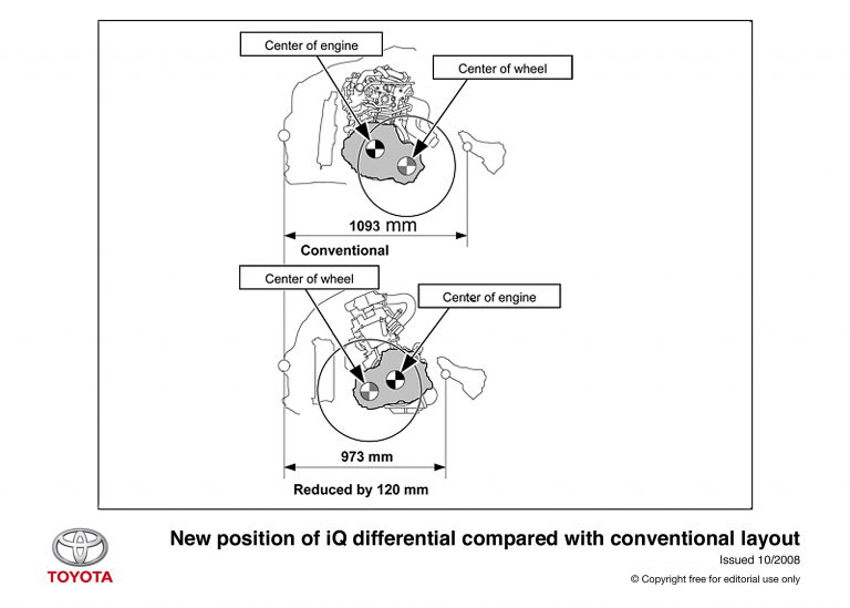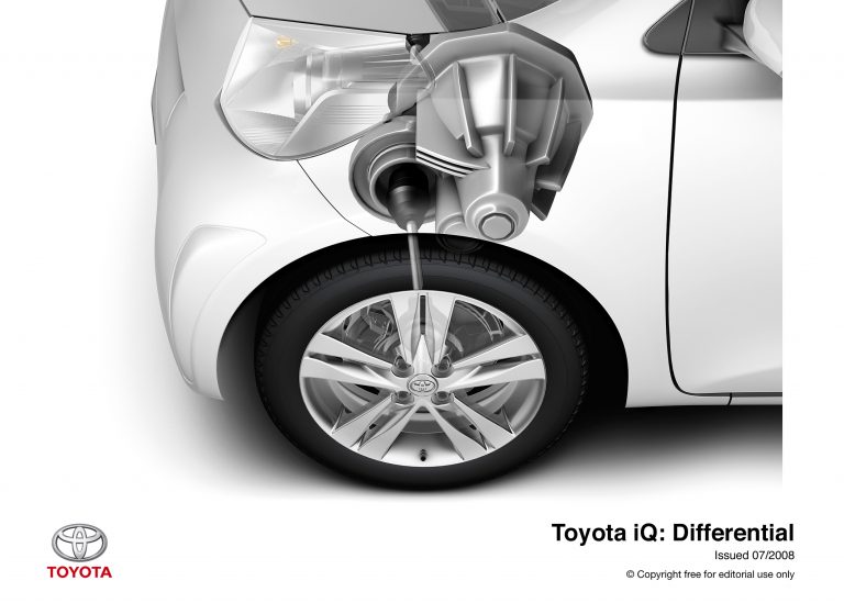 The position of the gearbox differential dictates the position of a car’s driven wheels and is traditionally a limiting factor on how space under the bonnet can be used. Toyota’s brainwave was the simple but highly effective idea of moving the differential in front of the engine, a concept that opens up new and radical opportunities for iQ’s small-but-spacious design.