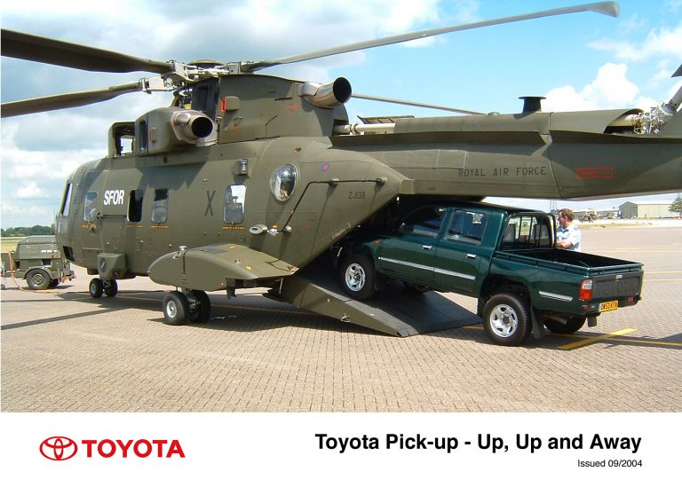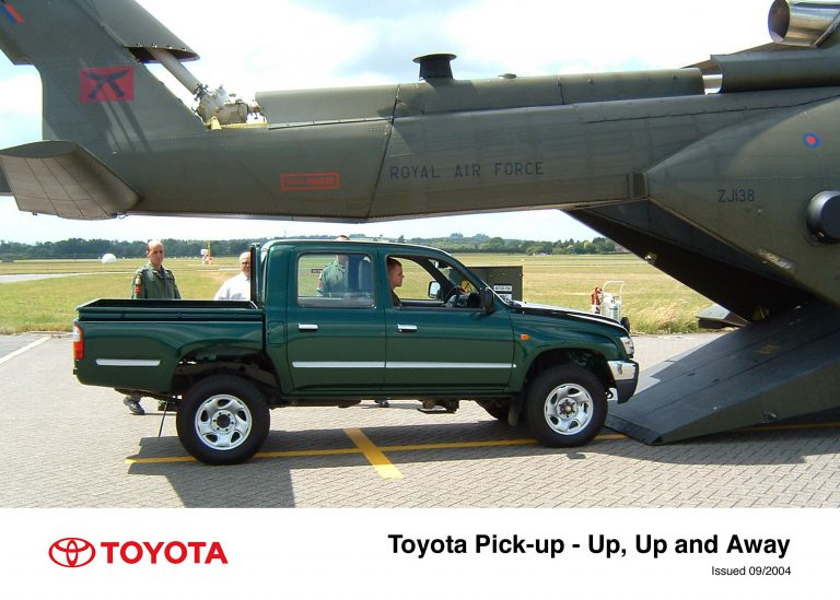 The trial took place at 28 Squadron RAF Benson using a Hilux Double Cab EX provided by the Inchcape Oxford Toyota centre, located in nearby Kidlington. In keeping with the squadron motto “Whatsoever you can do, do”, it took just half an hour to demonstrate that the Hilux could be driven up and down the helicopter’s load ramp in and out of the cabin without the need for any structural changes to the aircraft.
